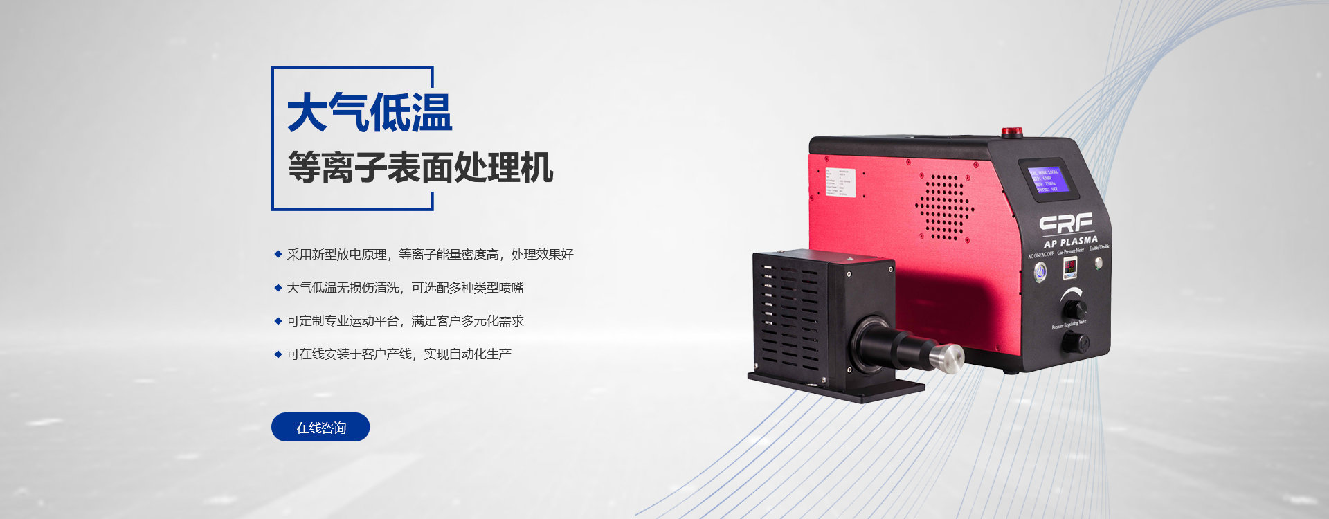 ①可選用自研等離子設備整部件取進心配件組開。 ②標準型號等離子設備少期備有現貨,交貨工夫快! ③充分考慮各行各業的需供特點,能按照客戶的利用處景進行人道化的產品計劃。 ④可按照不同的客戶需供供給等離子處理方案。